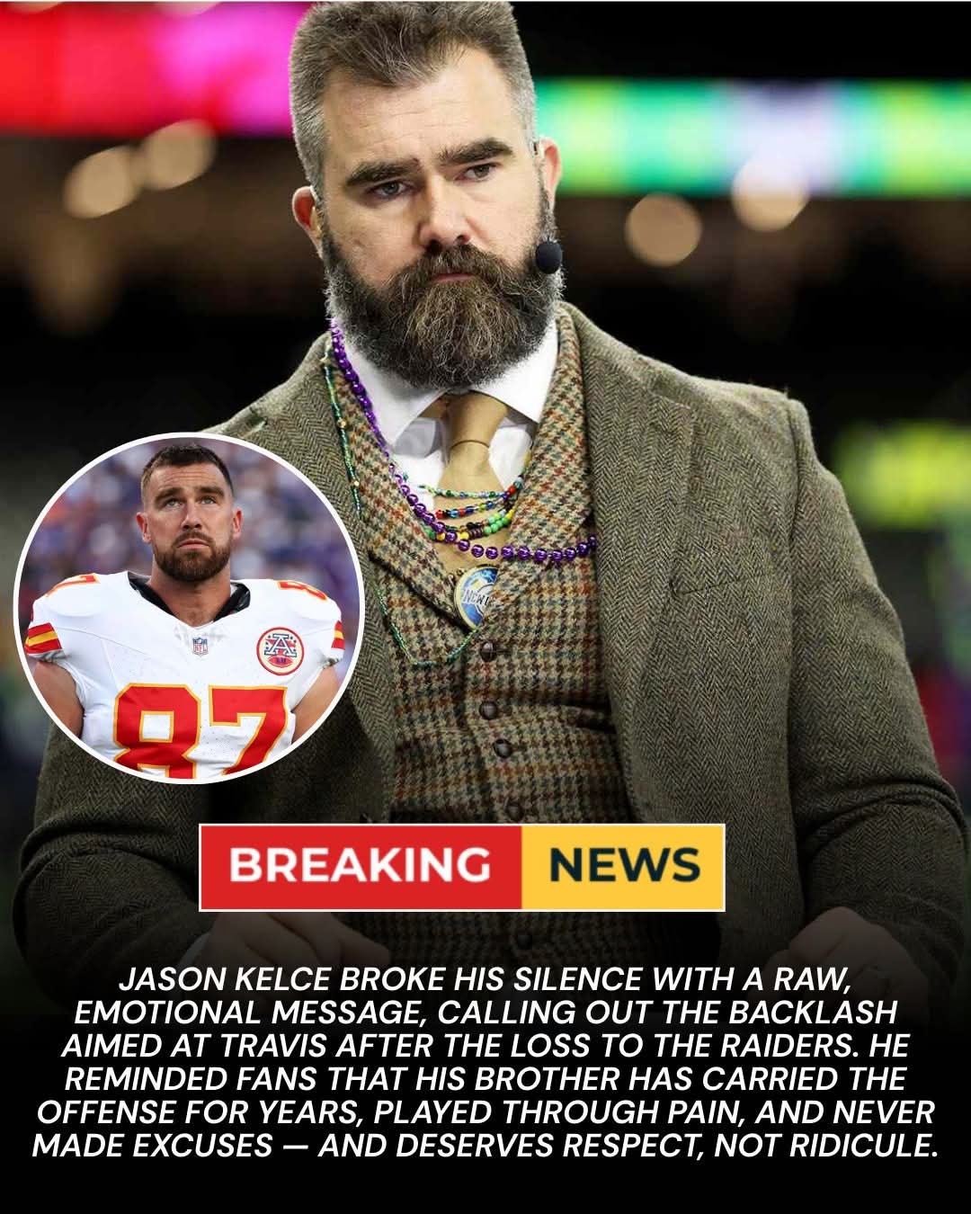🔥 JASON KELCE SPEAKS OUT: Jason Kelce Defends His Brother Travis Kelce After the Loss — “This Isn’t Just Criticism. It’s an Insult to Football.” Jason Kelce broke his silence with a raw, emotional message, calling out the backlash aimed at Travis after the loss to the Raiders. He reminded fans that his brother has carried the offense for years, played through pain, and never made excuses — and deserves respect, not ridicule.