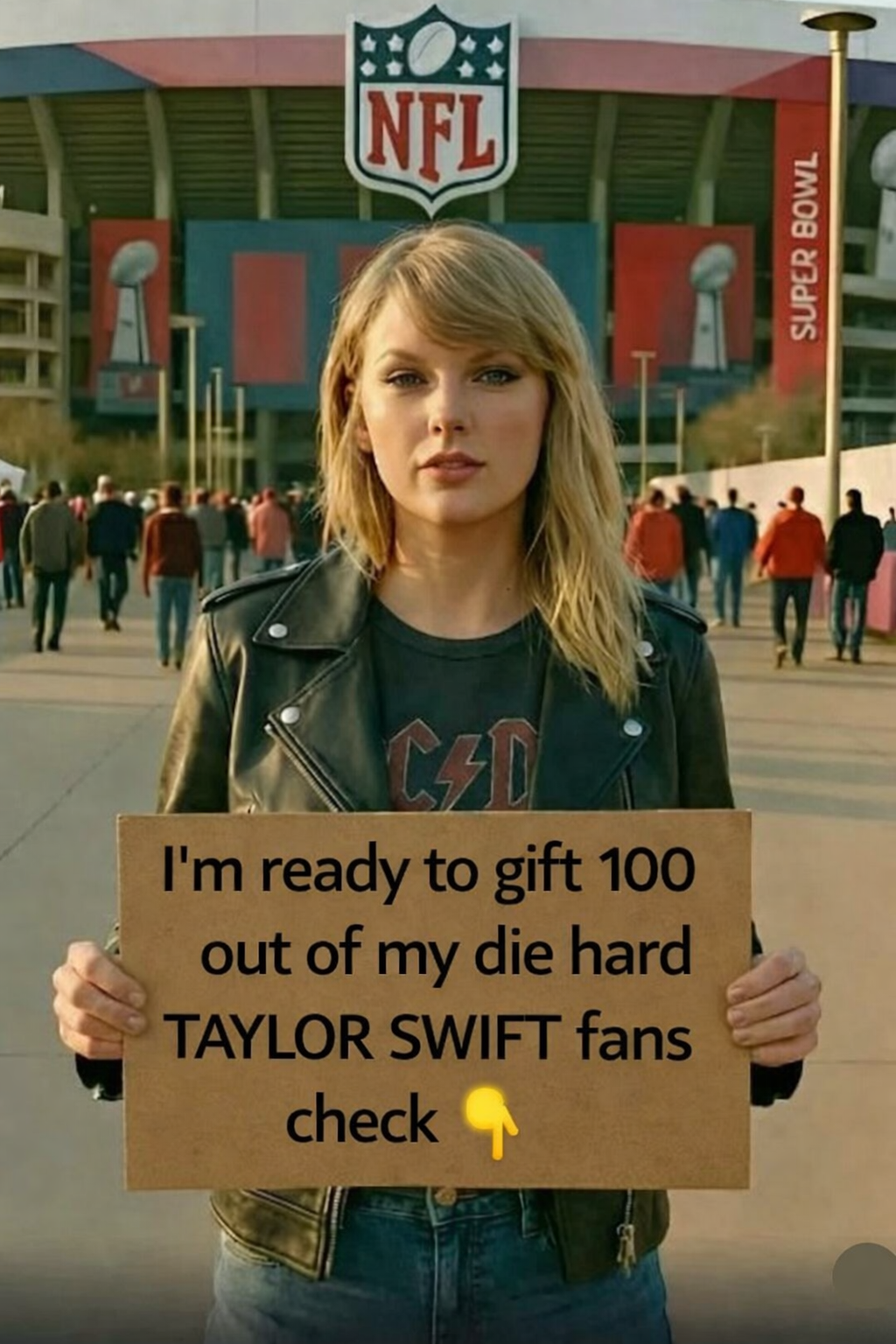 A viral image circulating online shows a global pop superstar outside an NFL stadium holding a sign teasing a surprise giveaway for her most loyal fans. The post has sparked massive engagement, with fans flooding comments and speculating what the “gift” could be as Super Bowl excitement builds.