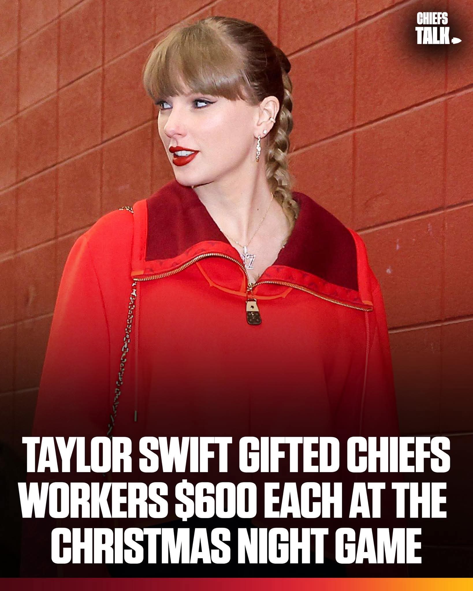 Taylor Swift gifted Chiefs stadium workers $600 each at the Christmas Night game vs the Broncos. Some members of staff told the story and shared that is essentially two weeks wages for them 🥹 Taylor is one of a kind ❤️