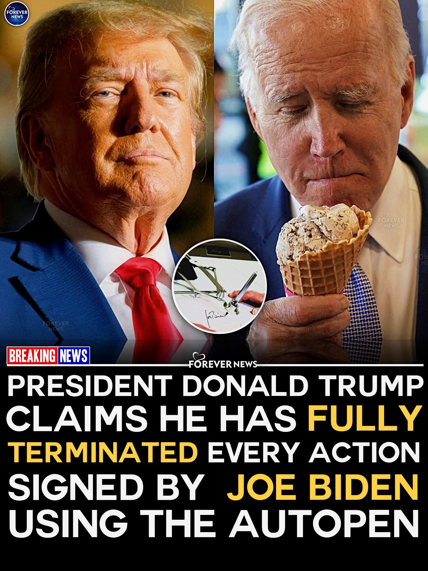 Trump says he has fully terminated Biden executive actions signed by autopen, arguing they were unauthorized and claiming decisions shaping the nation must be personally approved by the president, not mechanically signed by a device.