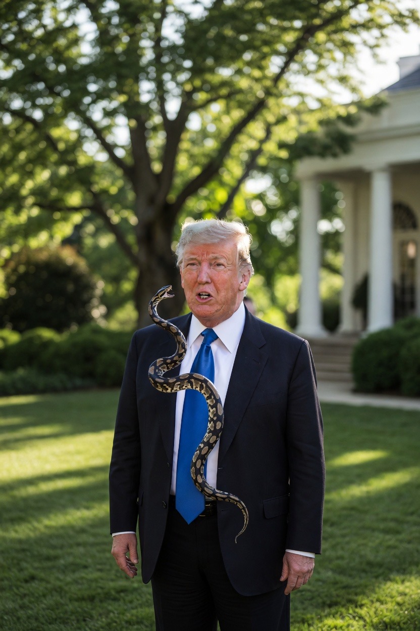 Yet, flip the perspective, and the image flips with it. Here, Trump emerges not as the victim, but as the conqueror. With his signature resolve, he could be the one gripping the snake, strangling its influence and exposing its venom. This reading aligns with Trump’s long-standing use of snake imagery in his own rhetoric. For years, he famously recited the poem/song “The Snake” at rallies — a parable about a tenderhearted woman who takes in a freezing serpent, only to be bitten. Trump used it as a stark warning about the risks of unchecked immigration and misplaced trust: “You knew damn well I was a snake before you took me in.”